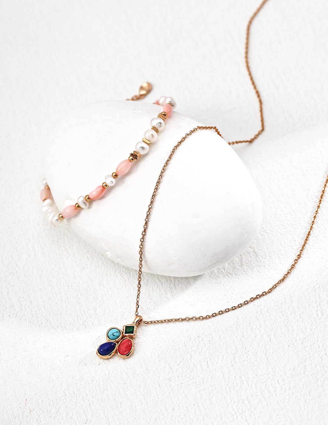 Chruthaigh cripteolithurgaithe meánaoiseacha an crochadán seo chun croílár eiliminteach a cheangal, agus a fhráma 2cm ag macasamhlú plátaí grimoire heirméiteacha. Tá praisiolít cearnach glas (maitrís an domhain) mar choróin ar an dearadh, os cionn triúr eisceachtaí crómatacha: siorcóinia deora gorm (sreabhadh uisce), criosacolla gearrtha le beiril (anáil an aeir), agus agáit ubhchruthach scarlóideach (croílár na tine). Crochta ó 40cm. SSlabhra airgid 925 le plátáil óir 18K retro, déanann an t-eagar geoiméadrach aithris ar léaráidí atamáire ailceimiceacha. Tá cód LV micrea-ghreanta ar an síneadh 6cm, agus tá a chainéil flosc 0.2mm séalaithe faoi bhrú chun luaineachtaí eiliminteacha a choinneáil siar.