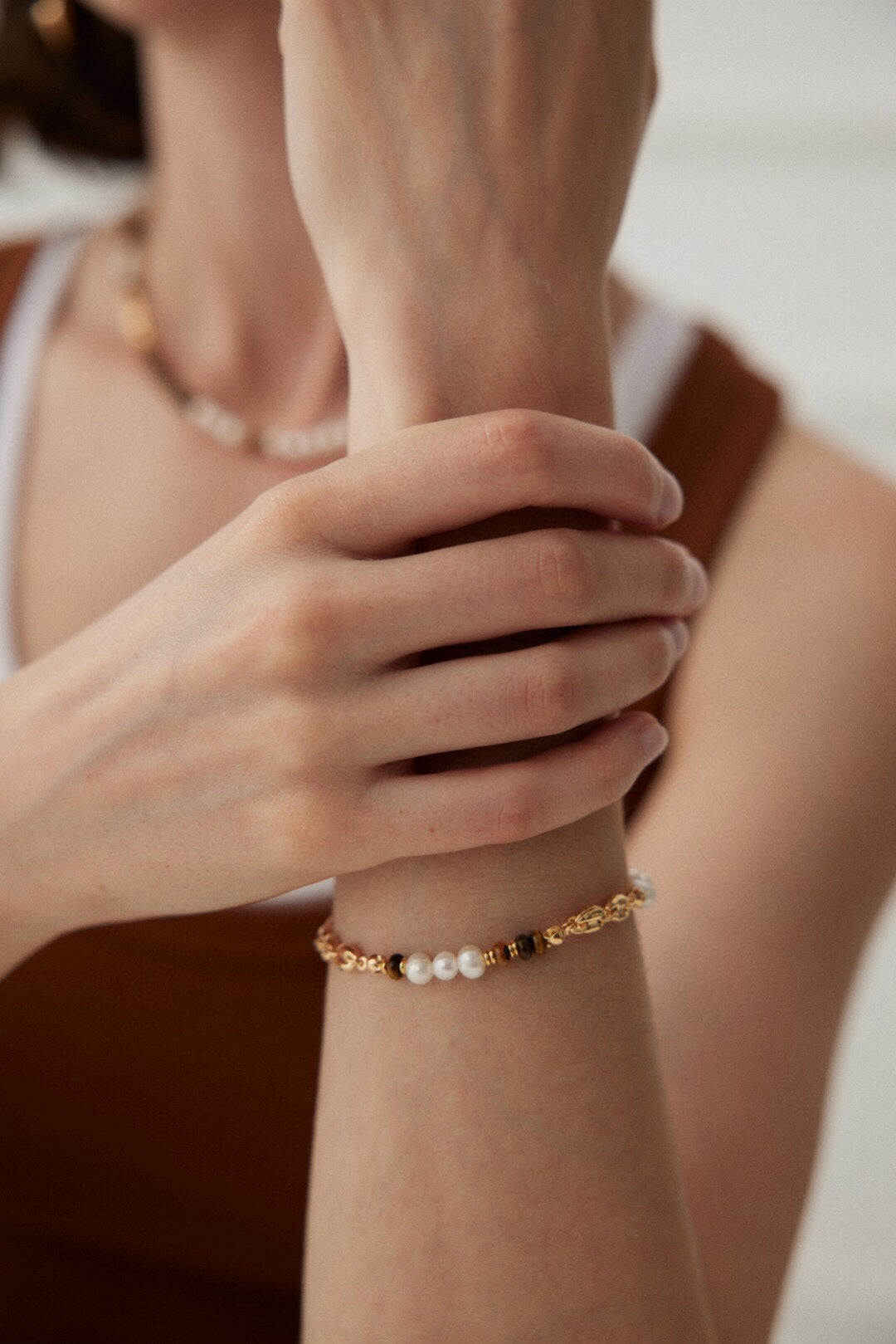 ✦ Alternating sequence: Pearl → gold bead → tiger’s eye → gold bead