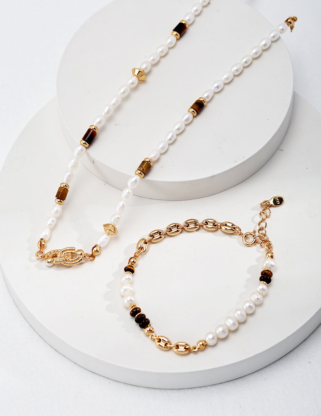 ✦ Earthy Elegance: Warm tiger’s eye tones contrast pearls’ cool luminosity.