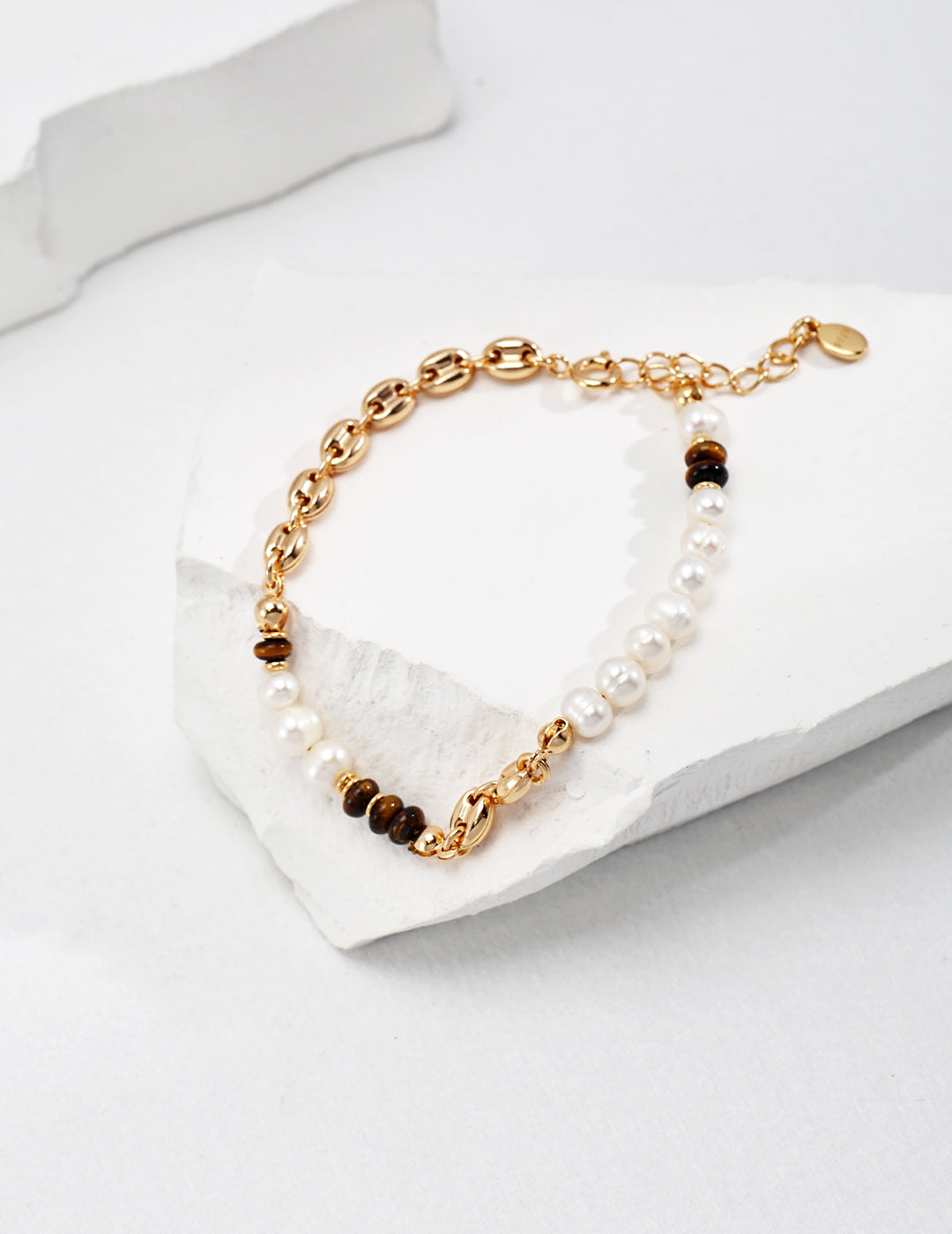 At the desert’s twilight hour, 5-5.8mm pearls cluster like condensed moonlight beside tiger’s eye stones – their 4.5-5mm surfaces striated with captured sunlight. This cuff embodies nature’s duality: pearls whisper of oasis springs, tiger’s eye hums with arid heat, all bound by 18K gold-plated chains that mimic sand-swept dunes. The alternating rhythm of organic gems and metallic precision mirrors the balance between wilderness and human artistry.