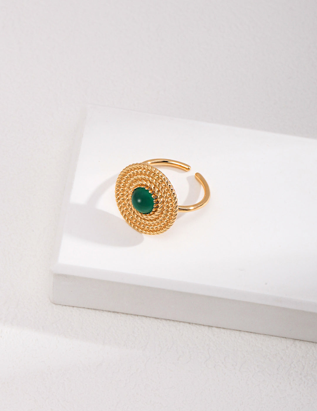 Where the Fates braid destinies with golden threads, this ring's coiled rope motif becomes a celestial loom. The 6mm chrysoprase glows like captured forest essence within its knotted embrace, its moss-green depths swirling with earth's primordial memories. Each twist in the antique gold band mirrors the sacred spiral of growth – a tangible covenant between raw nature and human artistry, forged for those who write their own legends.