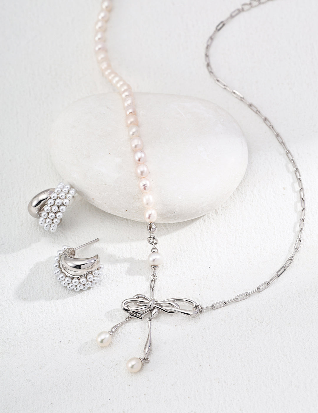 ✦ Dhá phéarla 3mm ar crochadh ó eireabaill an bhogha le slabhraí micrea-dofheicthe