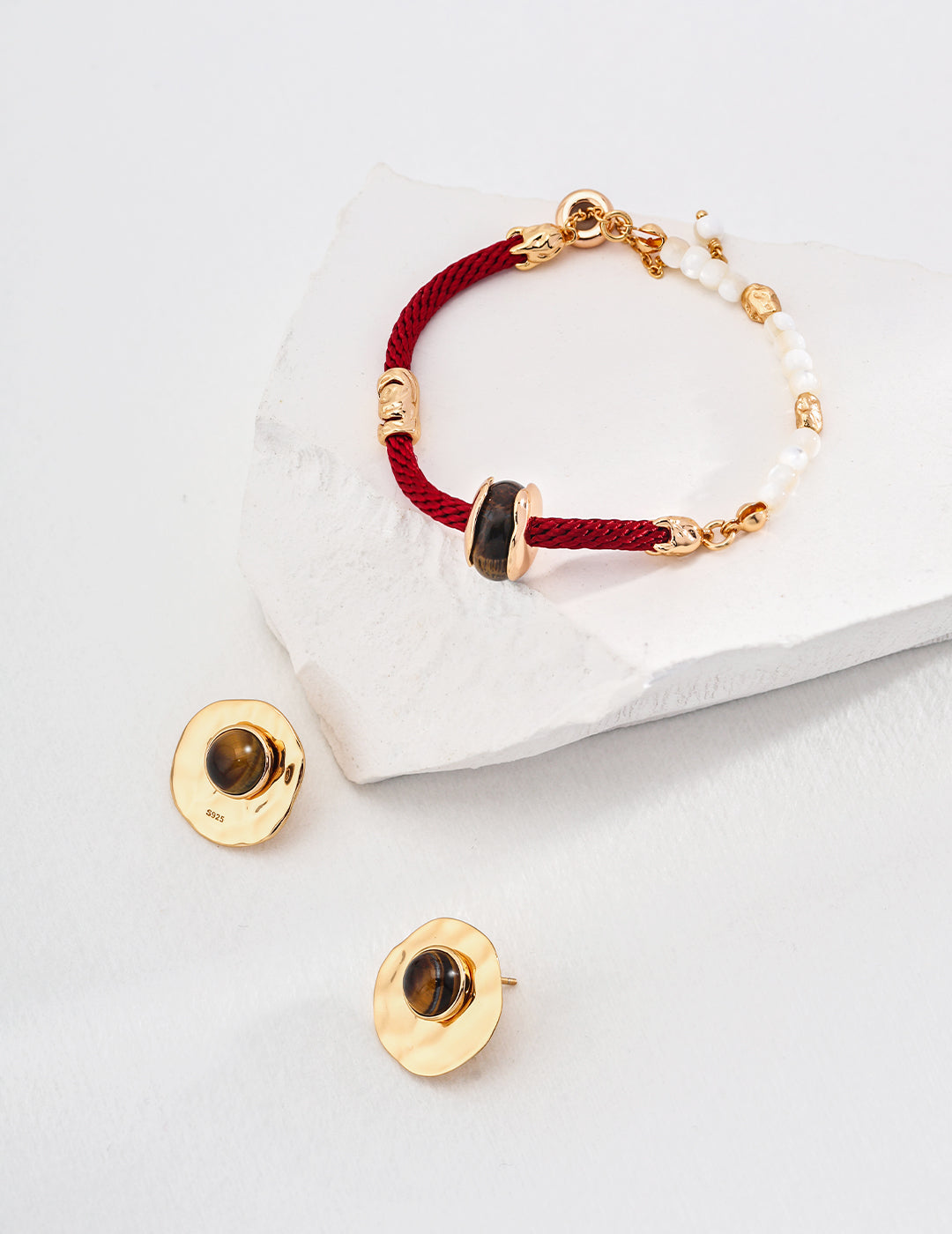 Where desert winds carve tiger’s eye into liquid amber, this bracelet captures the hour when caravans pause under blazing skies. The 1.2cm stone glows like captured sunlight, flanked by silver-lined mother-of-pearl discs that mimic mirage pools—each link a testament to S925 silver forged with 18K gold’s ancient warmth. For wrists that command both nomadic freedom and royal legacy.