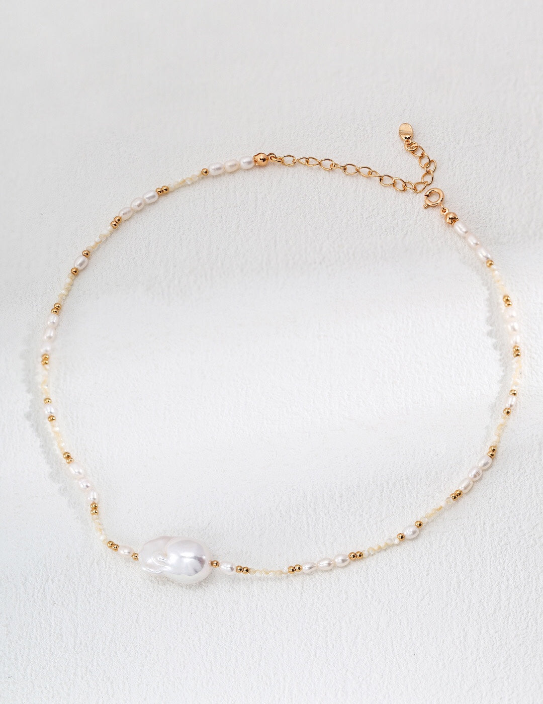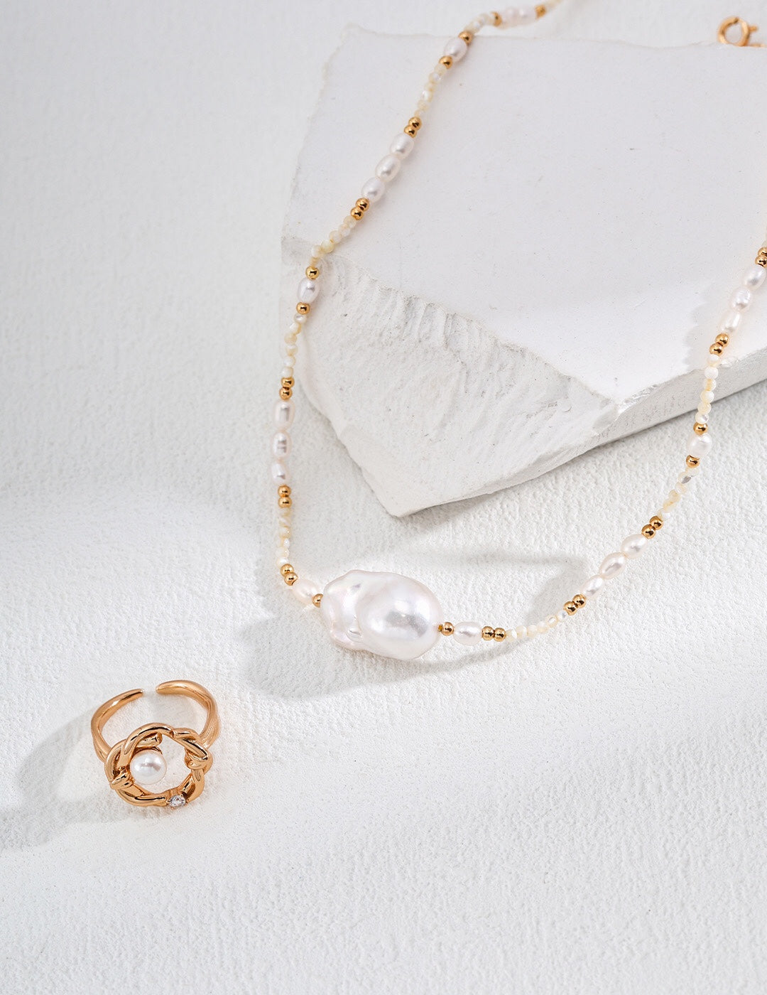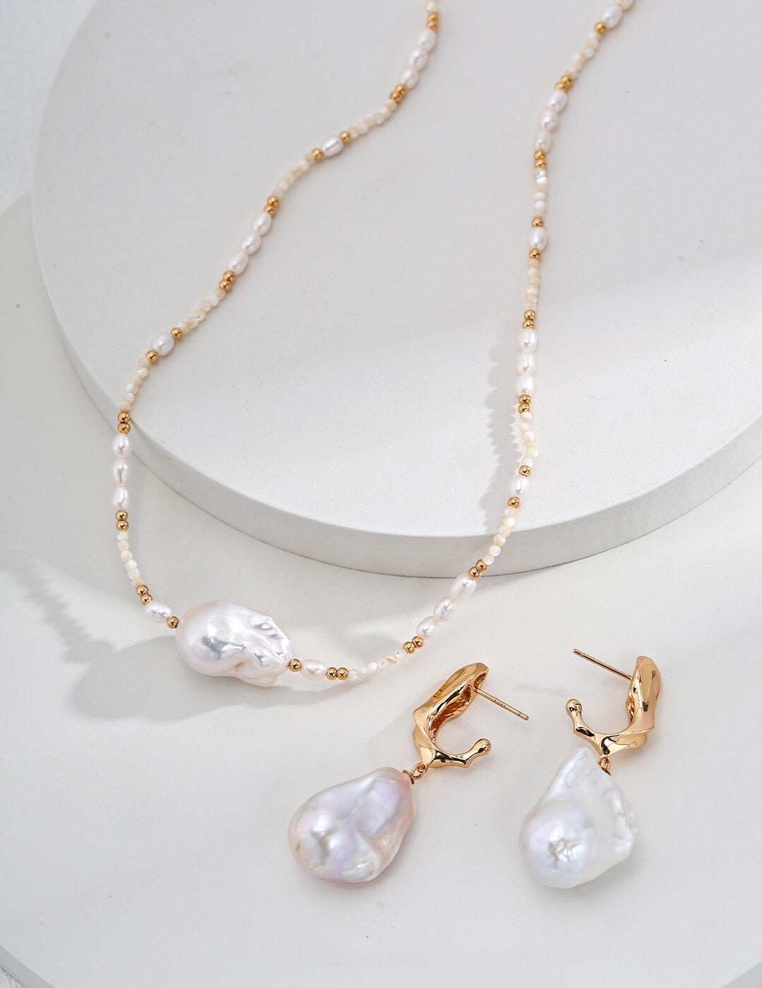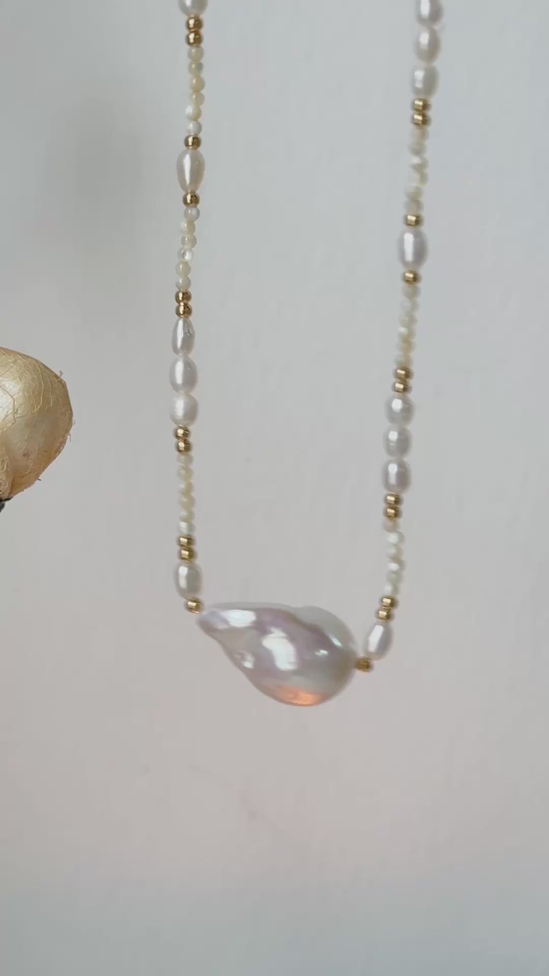 Sna doimhneachtaí ciúine ina scaipeann solas na gealaí trí fhoraoisí coiréil, criostalaíonn an muince seo ceardaíocht is míne an aigéin. Tá péarla barócach - a scáthchruth neamhrialta ag macalla greann na sruthanna taoide - ina ancaire don dearadh, agus péarlaí síl 3.5mm agus dioscaí máthair-péarla 2mm ar gach taobh di a lonraíonn cosúil le gathanna gealaí scaipthe ar thonnta meán oíche. Tá coirníní óir seanré ag poncaíocht an tslabhra 36cm cosúil le seoda báite, a dteas órga i gcodarsnacht le lonrúlacht oighreata na nacre - simfónie de ghalántacht farraige atá sreangaithe ar shnáithe airgid.